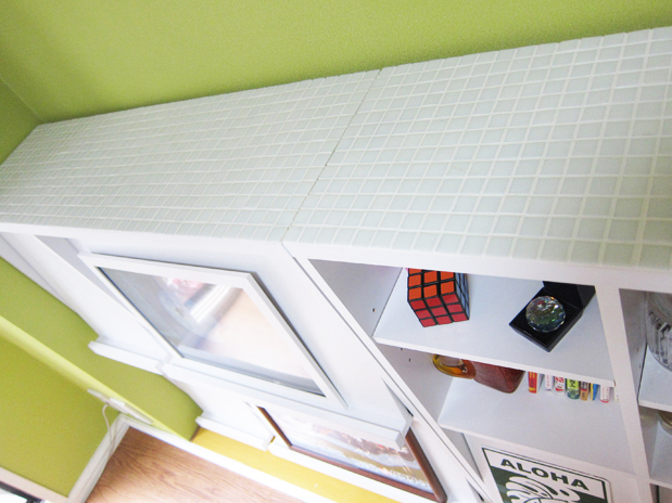 あまった白色ガラスで トイレの壁や本棚の上棚に使用し、魚ドット絵部分で抜き出したマリンブルーグラスを洗面台横に貼りました。