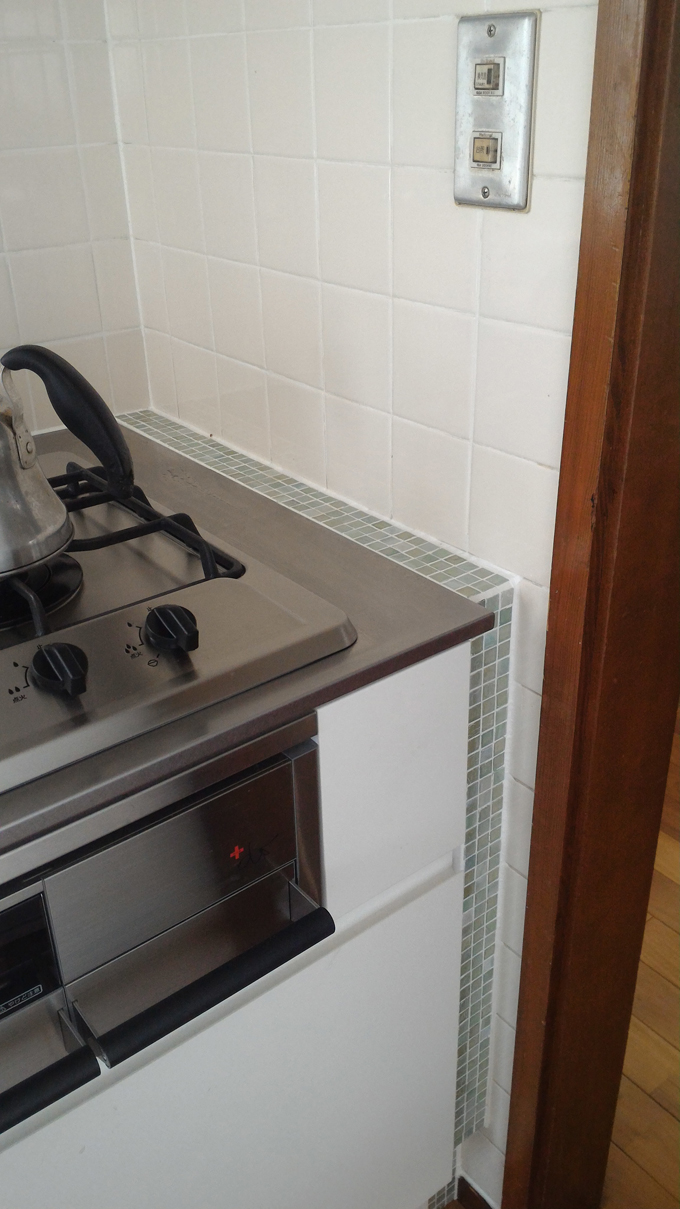 システムキッチンリフォーム時に出来た5cmの隙間処理に使わせていただきました。従来は260cm幅のキッチンを255cmの既製のシステムキッチンに代えたため。カットしなくても良いサイズと、ホワイト基調のキッチンに色を加えてみたく淡い緑色のタイルを選びましたが大成功でした。